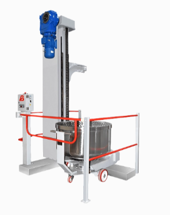 Подъём дежи осуществляется перемещением каретки с захватом по стойке с помощью цепной передачи.