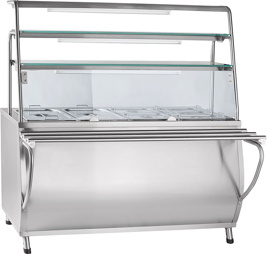 Мармит 2-х блюд с г/ёмкостями ЭМК-70Т-01 "ПРЕМЬЕР" паровой, с подсветкой Время разогрева ванны до рабочей температуры (не более 85°С): 30мин. Мармит оснащен набором из 6 гастроемкостей: 1x( GN1/1x150), 2x(GN1/2x150), 3x(GN1/4x150), которые обогреваются паром, поступающим из ванны, вода в которой нагревается ПЭН-ми. Двойная полка над мармитом имеет лампу подсветки, площадь выкладки 0,87 м2. Над верхней полкой расположена крыша(также с подсветкой). Внизу расположен нейтральный закрытый шкаф. Направляющие для подносов, гастроемкости и регулируемые по высоте ножки входят в комплект поставки.