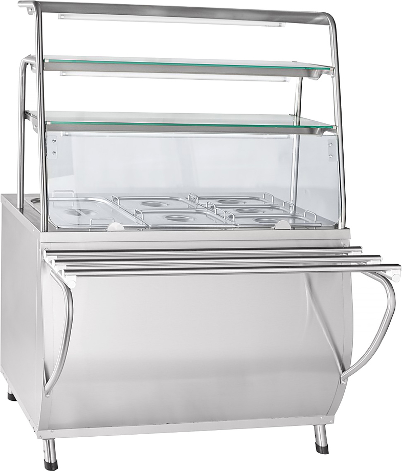 Мармит 2-х блюд с г/ёмкостями ЭМК-70Т "ПРЕМЬЕР" паровой, с подсветкой Время разогрева ванны до рабочей температуры (не более 85°С): 25мин. Мармит оснащен набором из 6 гастроемкостей: 1x( GN1/1x150), 2x(GN1/2x150), 3x(GN1/4x150), которые обогреваются паром, поступающим из ванны, вода в которой нагревается ПЭН-ми. Двойная полка над мармитом имеет лампу подсветки, площадь выкладки 0,64 м2. Над верхней полкой расположена крыша(также с подсветкой). Внизу расположен нейтральный закрытый шкаф. Направляющие для подносов, гастроемкости и регулируемые по высоте ножки входят в комплект поставки.