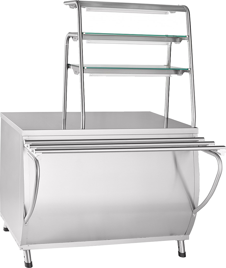 Прилавок горячих напитков ПГН-70Т "ПРЕМЬЕР" (стол нейтральный) полностью нерж. Прилавок горячих напитков предназначен для кратковременного хранения и раздачи потребителю хлебобулочных и кондитерских изделий, а также для установки на его столе термостата с напитками. Две стеклянные полки имеют площадь выкладки 0,43м2, над верхней оборудована крыша. Обе полки и крыша оснащены тремя лампами подсветки. На прилавке установлены 2 штепсельные розетки (16А). Направляющие для подносов и регулируемые по высоте ножки входят в комплект поставки.