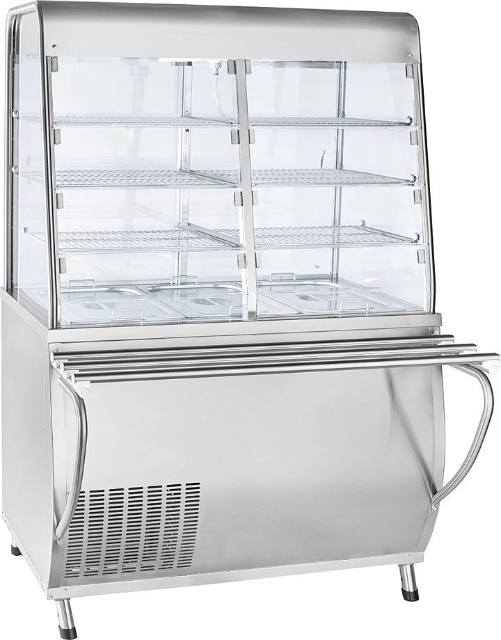 Прилавок-витрина холодильный ПВВ(Н)-70Т-С-НШ "ПРЕМЬЕР" полностью нерж. Плавная регулировка температуры 1...10°С. Хладагент: R404A. Внутренний объем закрытой витрины имеет принудительную циркуляцию охлажденного воздуха и 2 лампы подсветки. Демонстрационная площадь охлаждаемой ванны 0,49 м2, полкок: 1,34 м2. Внизу - нейтральный шкаф без дверок. Регулируемые по высоте ножки, полки, 3 гастроемкости GN 1/1-150 и направляющие для подносов входят в комплект поставки.