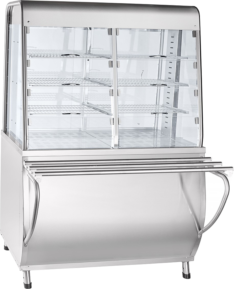 Прилавок-витрина тепловой ПВТ-70Т "ПРЕМЬЕР" закрытый Диапазон регулирования температуры воздуха в витрине теплового прилавка 20...60°С, время разогрева до рабочей температуры: 40мин. Демонстрационная площадь: 1,34 м2. Витрина снабжена тремя ярусами полок-решеток, тремя лампами освещения и вентилятором, закрытым кожухом. Направляющие для подносов и регулируемые по высоте ножки входят в комплект поставки.