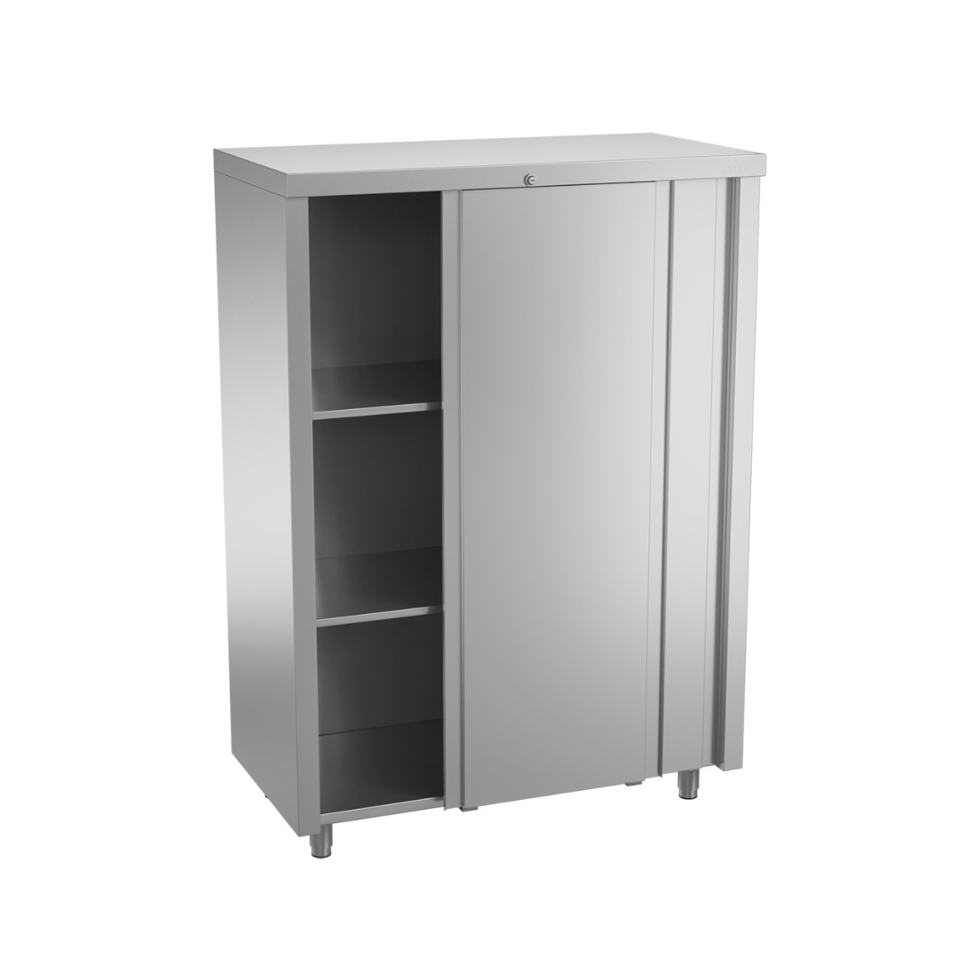 Шкаф кухонный ШЗК-950 (купе) (950х600х1750мм) Конструкция сборная, бескаркасная. Материал – нержавеющая сталь AISI 430 толщиной 0,8 мм. Задняя стенка и дно выполнены из оцинкованной стали толщиной 1,2 мм. В комплект шкафа входят 2 полки толщиной 20 мм, выполненные из нержавеющей стали и усиленные ребром жесткости. Нагрузка на одну полку – до 30 кг. Двери-купе выполнены из нержавеющей стали. Ножки пластиковые, запрессованы в трубу диаметром 50 мм из нержавеющей стали AISI 304. Замок для блокировки дверей.