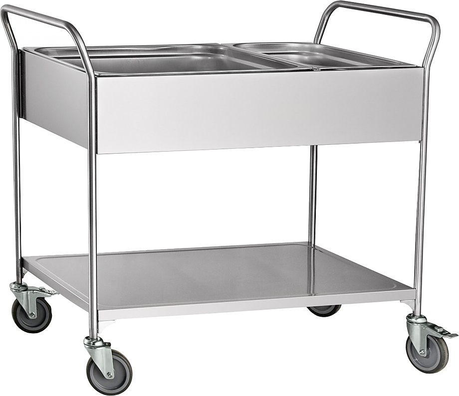 Тележка для сбора посуды ТС-100 полностью из нерж. стали Допустимая нагрузка 40 кг. Тележка укомплектована одной полкой и двумя гастроемкостями: GN 1/1x150 и GN 2/1x200.