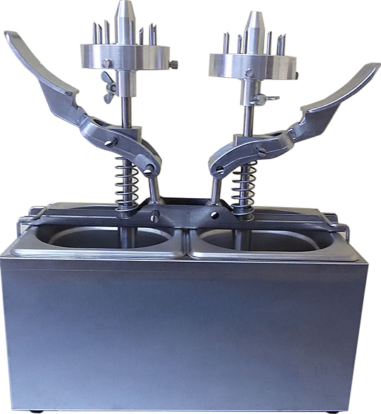 Дозатор начинок для начинения кольцевых изделий из теста (пышек, донатсов), механический, имеет в комплекте 2 насадки с 8 иглами и 2GN1/6 из нержавеющей стали, для двух начинок.