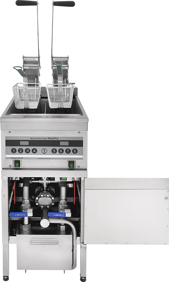 - Контроллер RoboLabs позволяет максимально гибко настраивать режим работы фритюрницы, переключать фритюрницу в режим ожидания в периоды простоя и затем быстро выводить на рабочий режим. Данная опция способна значительно уменьшить интенсивность окисления масла. Кроме того, можно установить периодичность фильтрации масла и записать до 4 программ на каждую корзину.