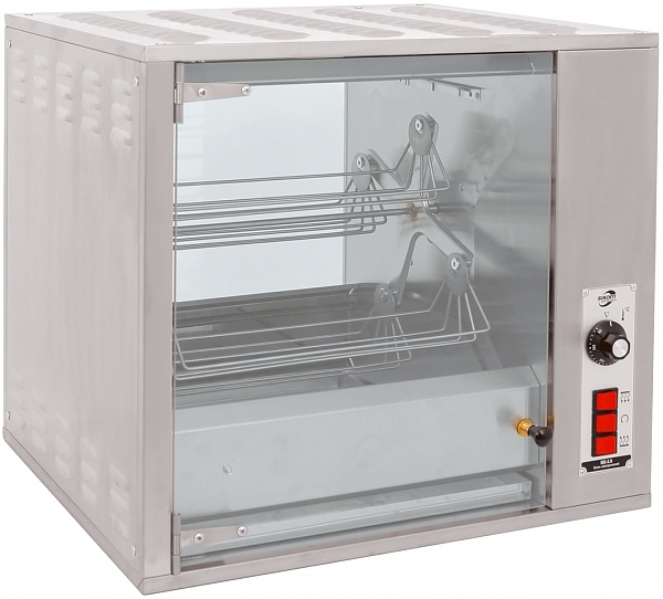 Гриль для кур электрический карусельный, с электромеханическим управлением, 1 камерой предназначен для для приготовления куры-гриль, а также иных мясных, рыбных и прочих полуфабрикатов. Гриль оснащен съёмным вертелом с 4 люльками-корзинами для приготовления 8 тушек весом 1.2-1.4кг. Время разогрева до +200С не более 30мин.