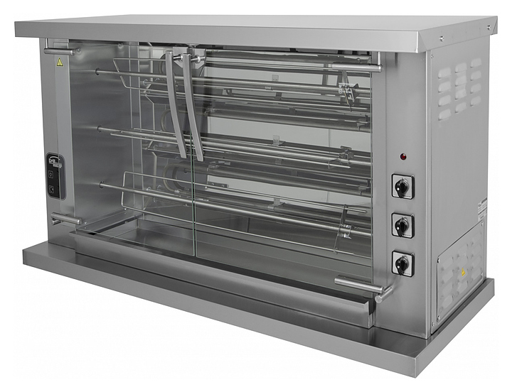 Гриль электрический шампурный Ф3Ш1Э (1280х430х750 мм, 380В, 7,3кВт, 76кг) Время приготовления 55 мин. Количество ТЭНов 3 шт. Количество шампуров 3 шт. Подсветка в камере. Стеклянные двери.