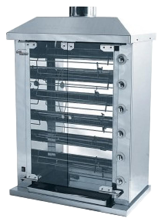 Гриль газовый шампурный Ф6У2Г (950x570х1290 мм, 220В, 21кВт, масса 122кг) 6 горелок (инфракрасные, автономные, съёмные). Полный газ-контроль. Количество шампуров 11 шт. Время приготовления 55 мин. Расход газа 1,9 кг/ч. Подсветка в камере. Стеклянные двери.