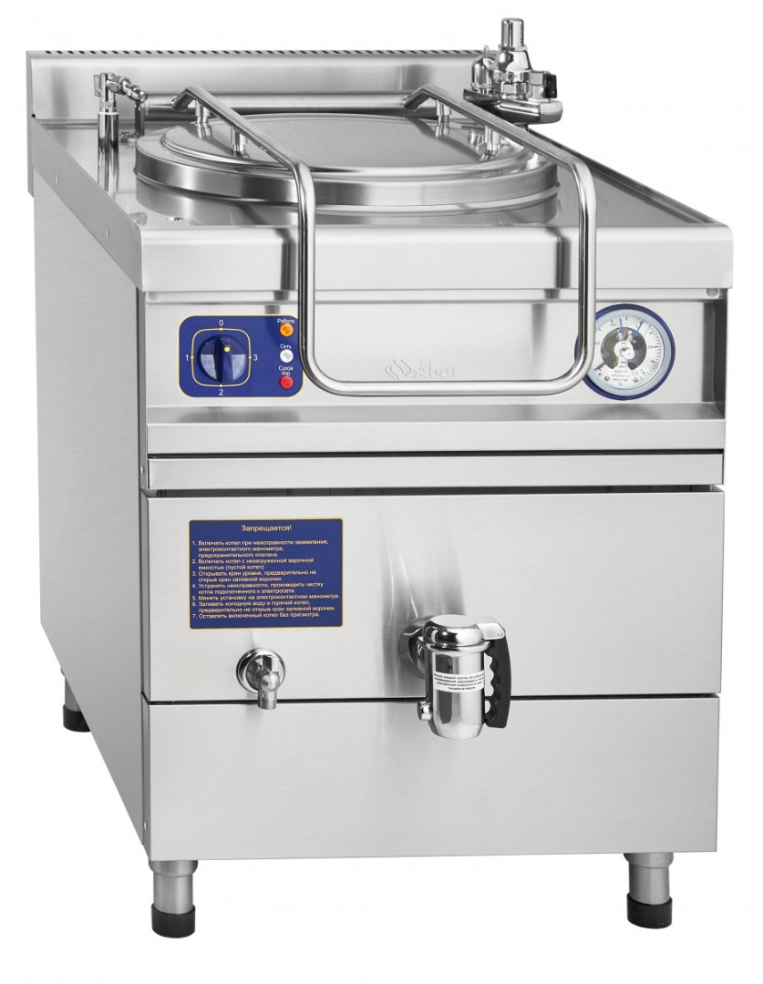 Котел пищеварочный электрический, сливной кран, паровая рубашка, цельнотянутый КПЭМ-60/9 Т 3 ТЭН-а, 3 режима работы, При отсутствии воды в "пароводяной рубашке" срабатывает автоматическое отключение нагрева. Время разогрева до 95°C - 45мин, Диаметр котла 425мм, Слив готового продукта осуществляется краном большого диаметра на лицевой панели. Регулируемые по высоте ножки.