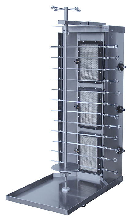 Шаурма-шашлычница газовая Ф3ШМГ (ручная) (515х800х1170мм, 11 кВт, масса 14кг) 3 горелки с ситемой газ-контроль. Производительность до 55 кг/мяса. 12 шампуров для шашлыка. Габариты поддона для шавермы 425х600х30 мм. Полностью из нержавеющей стали.