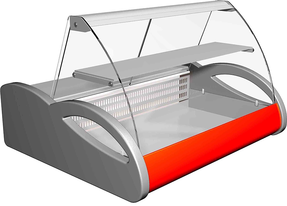 Витрина универсальная настольная 0,46 кв. м ВХСн-1,0 "Арго" (0...-6С, 1000х865х630 мм.) "Полюс" Температурный режим -6...0 °C. Управление с датчиком-реле температуры. Площадь выкладки 0,46 м2. Встроенный холодильный агрегат. Охлаждение - статическое. Изоляция столешницы, боковин и корпуса, выполненна из пенополиуретана. Экспозиционная поверхность, столешница - из окрашенной оцинкованной стали. Витрина комплектуется полкой, люминесцентной подсветкой, гнутым стеклом и ночными шторками из оргстекла. Декоративная панель красного цвета.